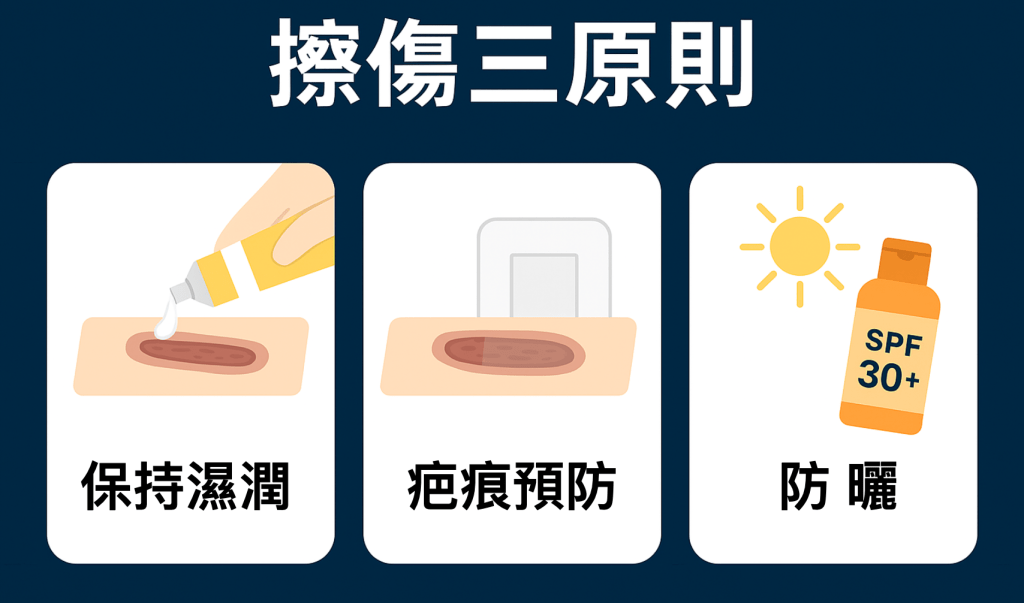 - 保持濕潤:塗凡士林+敷料,避免乾燥結痂,能讓皮膚更快長好。