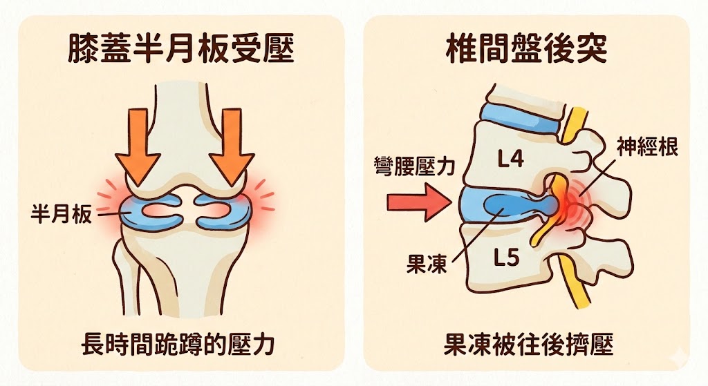- 膝蓋: 妳的膝蓋就像精密的齒輪,長時間跪或蹲,中間那塊「半月板」軟骨就會被死死壓住磨損,甚至破裂。