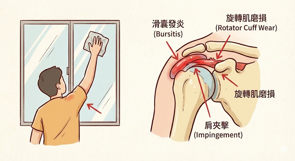 【受傷熱點】:肩頸、旋轉肌袖、滑囊炎 為了把窗戶擦亮、把櫃頂灰塵撢掉,妳長時間抬頭、手舉過肩,還不斷用力。 這時候,肩膀裡的「旋轉肌袖」會被骨頭夾擊,導致肌腱磨損發炎;肩膀裡的潤滑液囊(滑囊)也容易腫起來變成「滑囊炎」,讓妳手一舉就痛,晚上睡覺更是痛到醒。